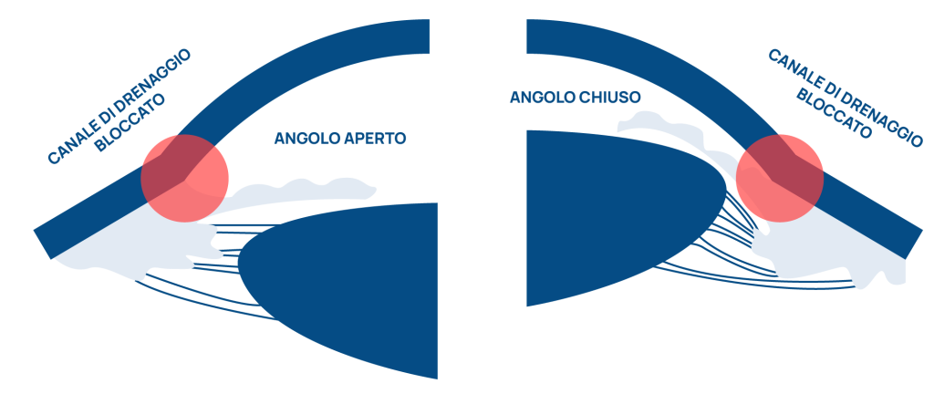 • Glaucoma ad angolo chiuso: l’angolo tra la cornea e l’iride si chiude improvvisamente, bloccando il deflusso dell’umor acqueo e causando un rapido aumento della pressione intraoculare che può portare ad un danno del nervo ottico